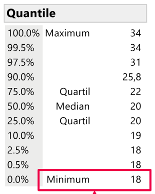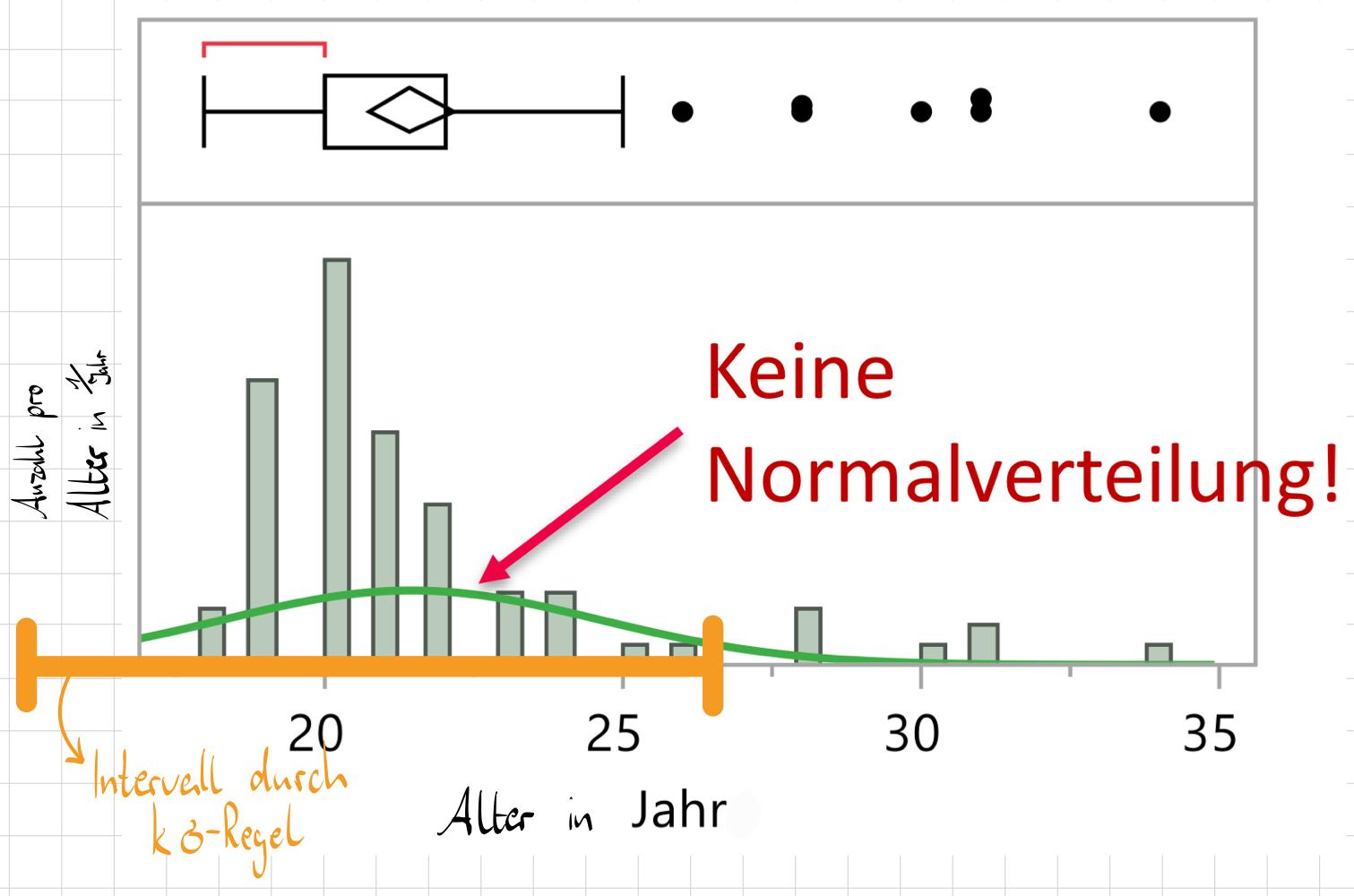 \Rightarrow Laut Sigmaregel soll das Mindestalter 15.27 Jahre sein, was jedoch auch nicht stimmt, wenn man sich die Quantillen anschaut: