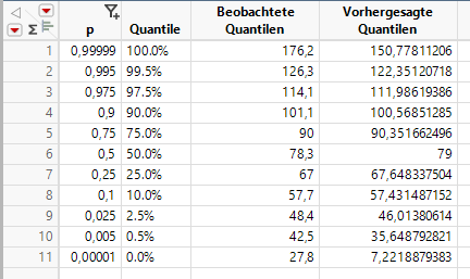 Gegeben ist folgende Tabelle mit den echten Beobachteten Quantilen p_i und der theoretischen Quantilen y_i aus der k-\sigma-Regel: