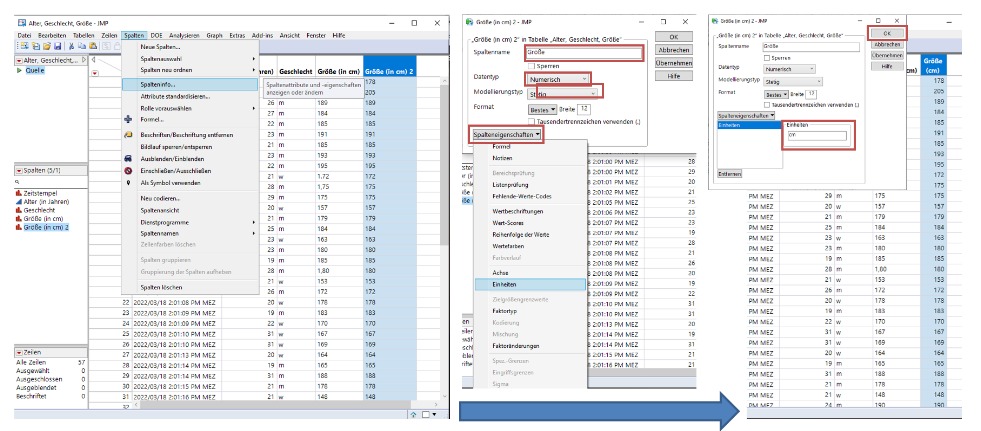 Typ, Skalenniveau, Einheit: Spalten können als numerisch oder Zeichen definiert werden; das Skalenniveau (Modellierungstyp) wird festgelegt (z. B. stetig, nominal) und Einheiten (z.B. “cm”) können vergeben werden.