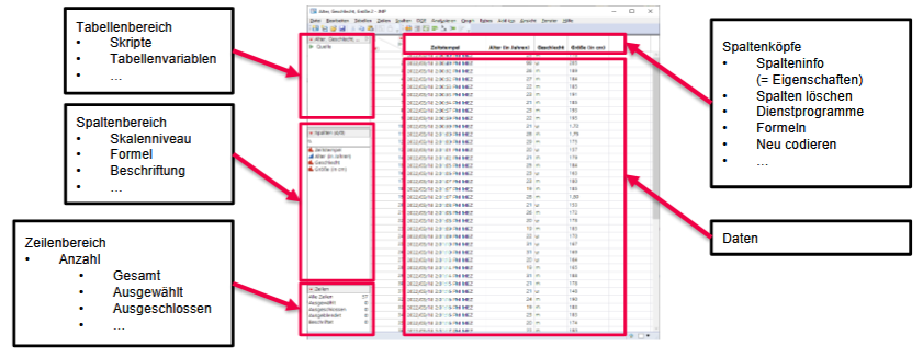Daten werden in Tabellenform organisiert, mit einem Bereich für Spalteninformationen und Zeilenstatus.