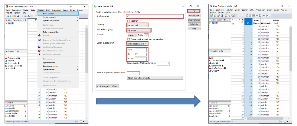 Neue Spalten (z. B. eine ID) können erstellt und mit Sequenzdaten automatisch befüllt werden.